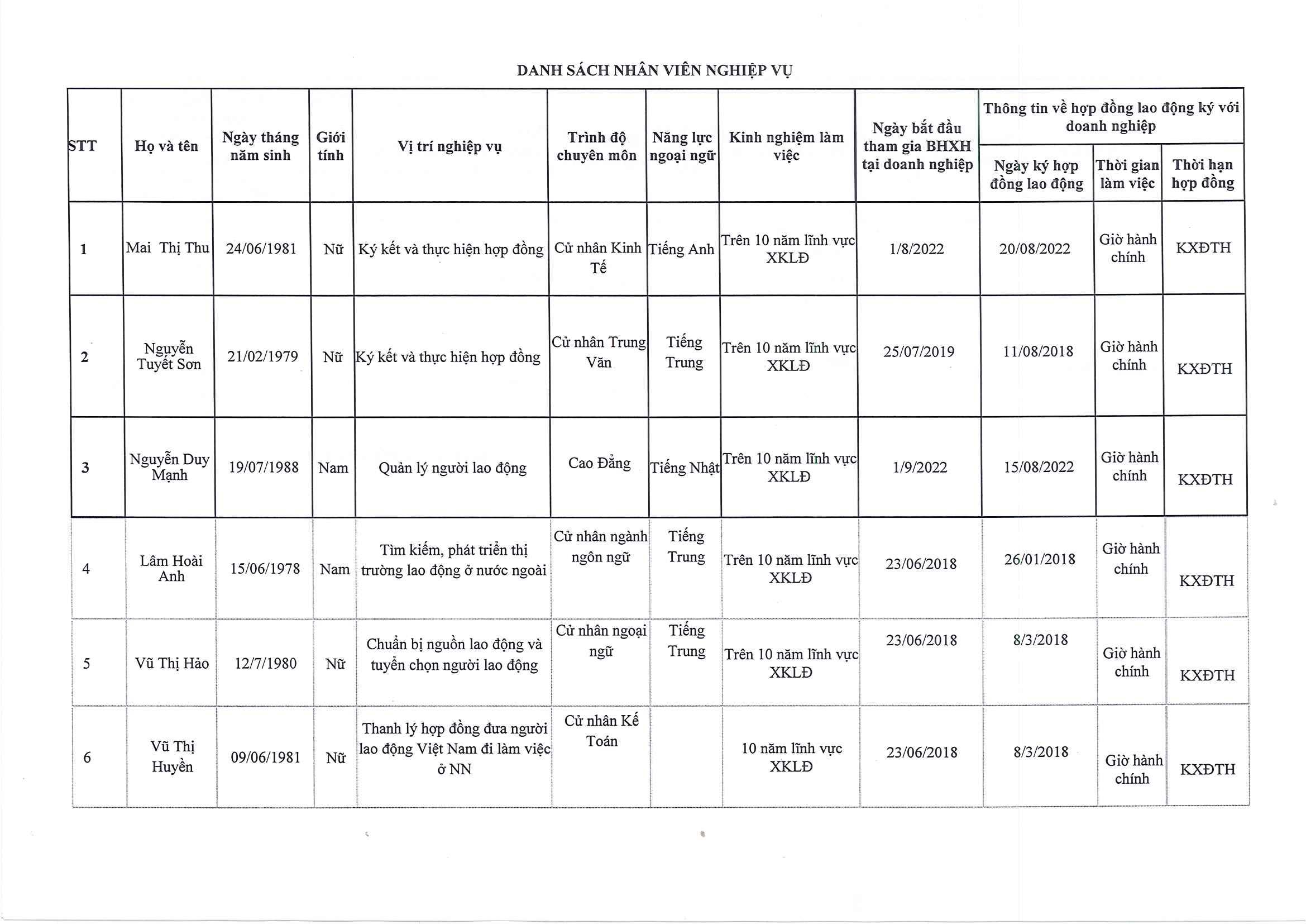 DANH SÁCH NHÂN VIÊN NGHIỆP VỤ THỰC HIỆN HOẠT ĐỘNG DỊCH VỤ ĐƯA NGƯỜI LAO ĐỘNG VIỆT NAM ĐI LÀM VIỆC Ở NƯỚC NGOÀI THEO HỢP ĐỒNG