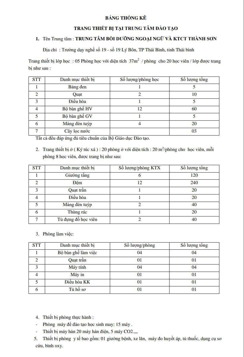 4. BẢNG THỐNG KÊ CƠ SỞ VẬT CHẤT TRUNG TÂM ĐÀO TẠO
