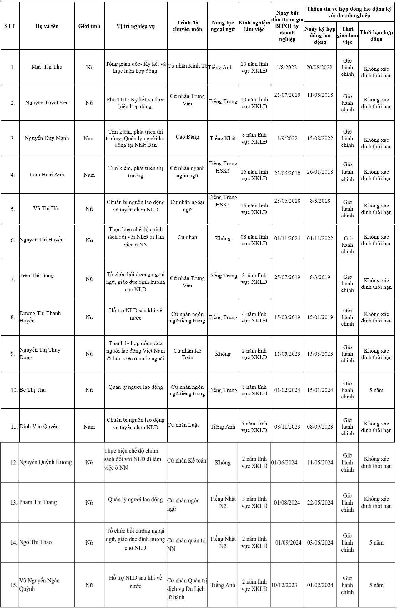 DANH SÁCH NHÂN VIÊN NGHIỆP VỤ THỰC HIỆN HOẠT ĐỘNG DỊCH VỤ ĐƯA NGƯỜI LAO ĐỘNG VIỆT NAM ĐI LÀM VIỆC Ở NƯỚC NGOÀI THEO HỢP ĐỒNG